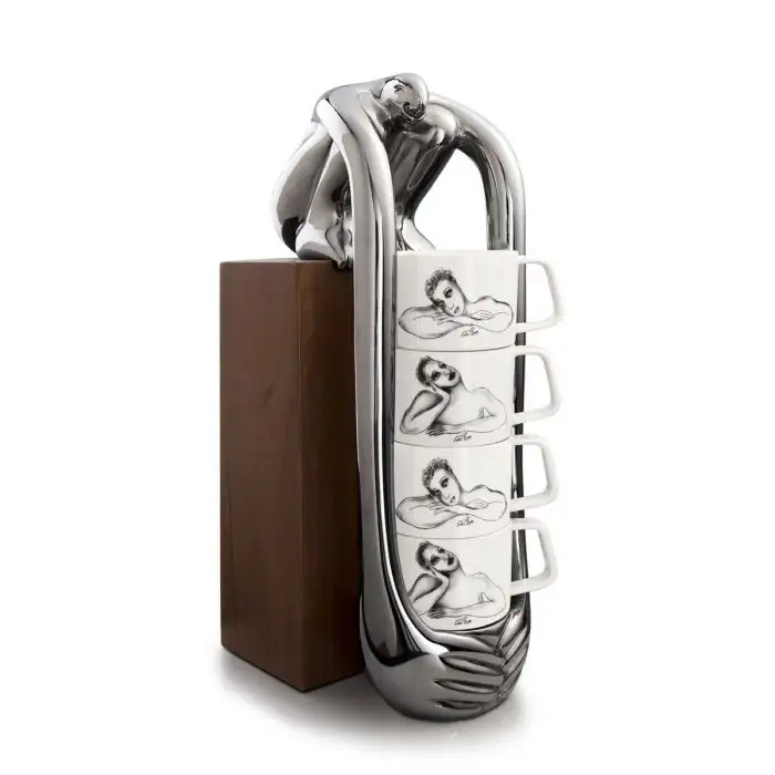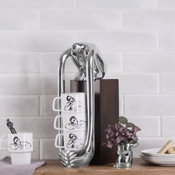 At full stretch’ is an iconic kitchen centerpiece and smart a storage solution. An aluminium sculptural figure crouches on a solid block of internationally acceptable acacia wood and stretches down his arms to cradle four porcelain mugs. Each mug is adorned with Carrol’s signature illustrations of bubbly figures, each differing in pose and expression. An added advantage to this iconic piece is that extra mugs can be purchased in sets of two. The mugs are dishwasher and microwave safe. Wipe sculpture and wooden block with a soft cloth or a damp cloth when necessary.