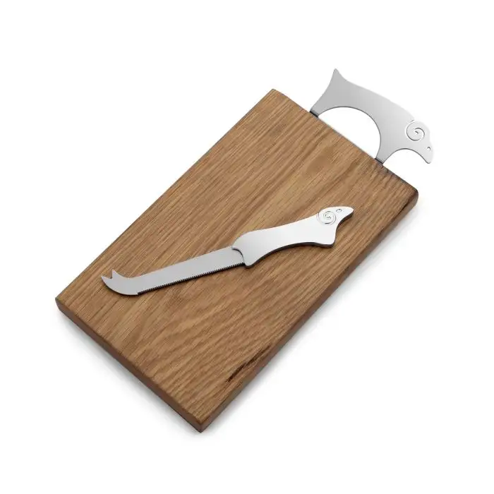 Present a sampling board of exotic cheeses or cold meats on this beautiful slab made from durable American oak — a wood highly regarded for its visual appeal and its distinctive grain pattern. Drawing its inspiration from the picturesque meadows, this smaller-sized serving board’s handle is a polished ram, laser cut from stainless steel. This charming feature is designed by Holly Birkby for Carrol Boyes, whose name is engraved at the base of the handle. The ‘ram’ small serving board is a functional piece of art that makes for a lovely house-warming gift, or use it as a cheeseboard along with the ‘ram’ cheese knife. For a larger spread, use alongside the large platter from our Organic range, or a selection of serveware from our hummingbird range. * Colour of the wood and grain may vary.