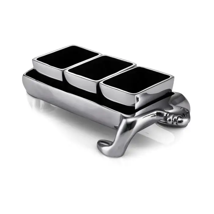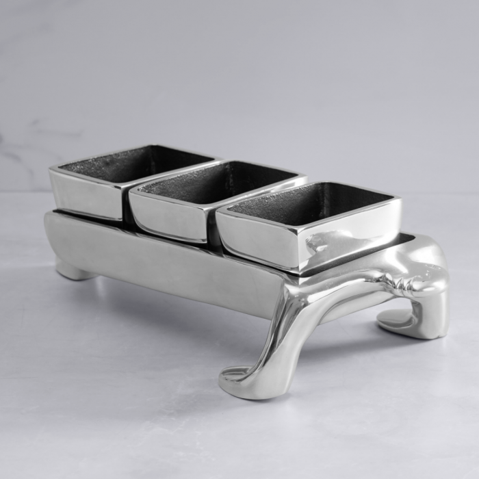 Inspired by the Inca tribe, this centrepiece consists of a man-like form supporting three rectangular bowls. Crafted from resilient aluminium and mirror-polished to perfection. Ideal for tapas & more!
