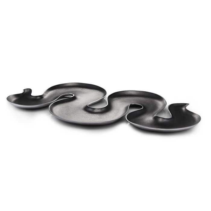 A large quicksilver centrepiece designed to adorn a lifetime of table settings. This heirloom piece forms part of our Iconics range. Fluid motions of liquid mercury are reimagined on this low-sitting centrepiece. Built to last, this piece is made of durable aluminium with a black powder-coated finish. A low centrepiece that encourages guests to connect without breaking eye contact, it’s perfect for large buffet tables and long dinner tables alike. Designed to display all types of culinary creations from pastries to tapas. Pair this with our selection of side plates and dessert spoons for a cohesive afternoon tea set. Wipe the sculpture with a damp cloth immediately after use and polish occasionally. We recommend handwashing the glass with warm soapy water.