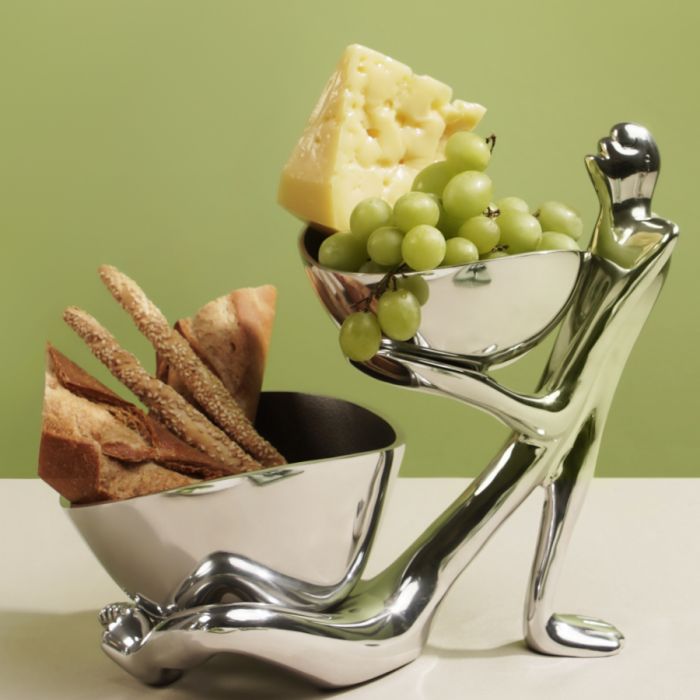 Laid Back stimulates thought-provoking conversations. Synonymous with the chip and dip designs in our Iconics range, a sculptural form reclines whilst balancing two bowls. This aluminium piece consists of a sculpture and two aluminium bowls, powder-coated on the inside to inspire a lifetime of dinner table banter. An innovative design suitable for displaying macarons at brunch or tapas at a cheese and wine evening. Inspired by a human form, it echoes our multifaceted nature through the sculpture’s ability to be styled on its own or with the bowls. Complementing your lifestyle, this piece needs only to be wiped down after each use and polished, occasionally.