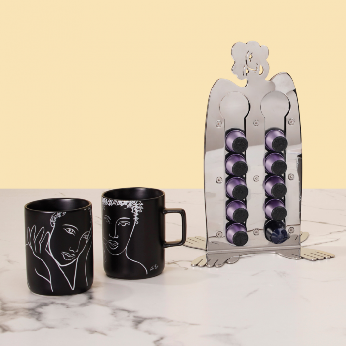 Store your complete selection of coffee pods neatly and visibly in this unique and elegant holder watched over by a serene human figure. Place this holder on your kitchen counter to hold and sort your coffee pods of any brand. 4 sections allow you to separate different strengths or decaffeinated pods for easy access.