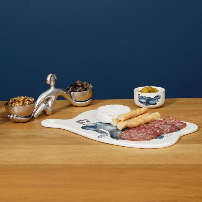 The ‘equal terms’ Condiment Set offers a unique viewpoint on innovative design and contemporary dining. Both a talking point and a serving piece, a nimble figure arches back balancing two bowls. Crafted from aluminium, the sculpture boasts a luminous mirror finish and the bowls are finished off with a black powder coating. From soy sauce on sushi nights to butter and jam at breakfast, this condiment set is as versatile as it is sophisticated. A certified iconic piece, complete the look by styling your table setting with our other iconics. Not dishwasher safe, Wash in warm, soapy water.