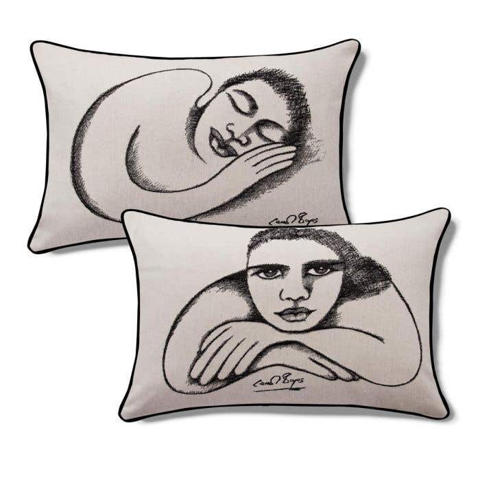 Carrol creates her sculptures from a series of drawings in an archive of sketchbooks. For many years, these drawings have been kept private as personal works of reference. The images from these sketchbooks are woven as a jacquard into the fabric, thus enhancing the detail of the drawings. Each unique cushion cover features two different faces. Made in South Africa from 100% cotton.