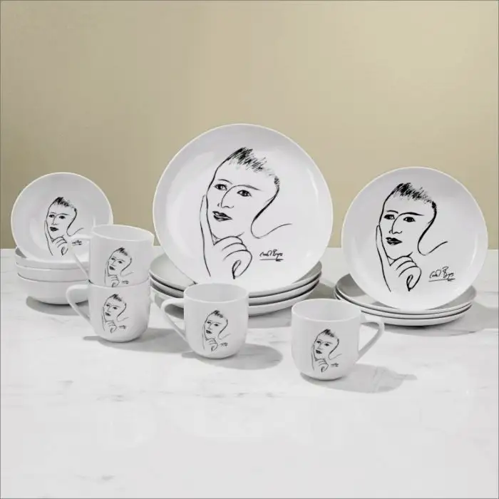 This luxury 16-piece Breakfast Set includes 4 x Dinner Plates, 4 x Side Plates, 4 x Cereal/Soup Bowls and 4 x Mugs, crafted from silky white porcelain highlighting Carrol’s famous Sketchbook design ‘distant memory’ in black. The popular Sketchbook addition is now available in a 16-piece Dinnerware Set. A modern yet classic Sketchbook take on designer dinnerware that will delight every guest at the breakfast or dinner table. The Sketchbook dinnerware range transitions effortlessly from casual dining occasions to elegant dinner affairs. This set accomodates an intimate 4-place setting for delicious breakfast settings. Dishwasher and microwave safe.