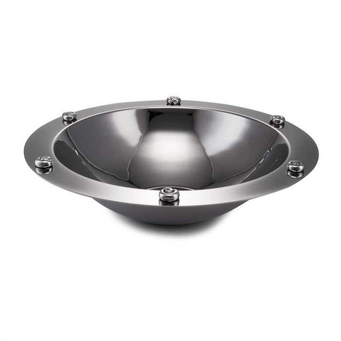 A beautiful bowl with timeless wave-like pewter embellishments indicative of Carrol’s early designs to decorate your dining table between meals. Made from durable stainless steel, this polished fruit bowl is not dishwasher safe but nonetheless easy to clean, so add your favourite seasonal fruits at any time.