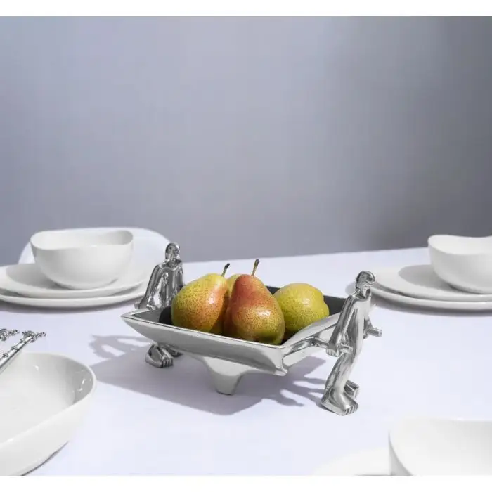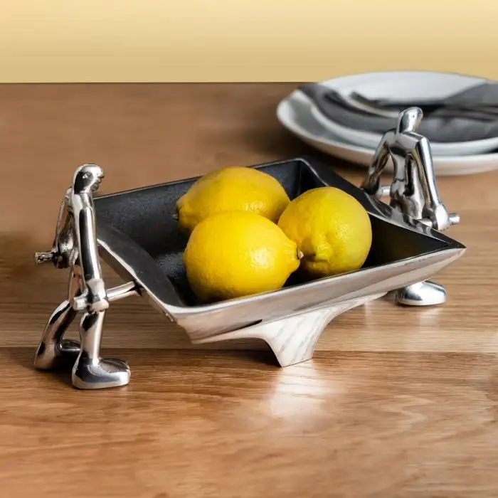 Carrol’s Mandarin Dish is a multi-functional piece designed to complement your home’s aesthetic and table setting. Named, ‘men at work’ this design symbolizes collaboration, teamwork and harmony. This square, medium-sized Dish is supported by two sculptural figures. An interior designer’s delight, the Dish is crafted from cast aluminium, with a black powder coating on the inside of the bowl, and a mirror polish finish on the outside. Celebrated by collectors, this iconic piece is suited to use as a fruit bowl on the kitchen counter, a roll basket at brunch or a statement piece on a coffee table. Explore our range of iconics, crafted to inspire joy around the dining table and home. Not dishwasher safe. Clean with aluminium paste and a polishing cloth. Gently handwash in warm soapy water when necessary.