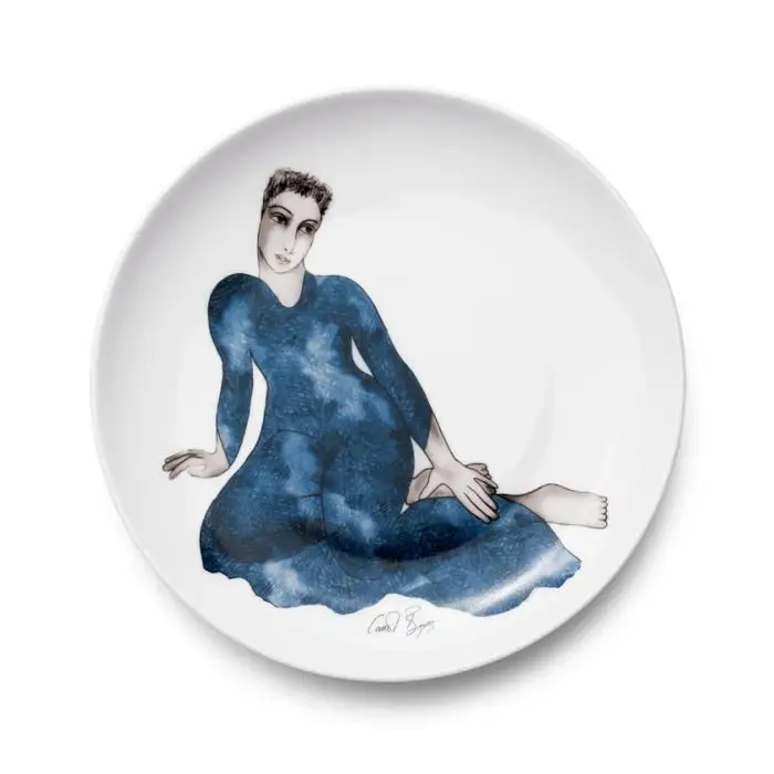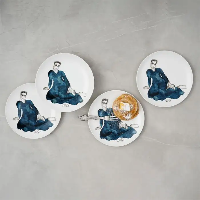 This charming set of four, Fine Bone China side plates forms part of the Indigo Girls range. They feature an original Carrol Boyes illustration of a woman sitting patiently, awaiting a tasty meal. The Indigo Girls range is characterized by illustrations of a mysterious woman in an indigo, watercolour dress. Carrol was inspired by a nomadic North African tribe called the Tuareg tribe, that she came across on a trip to Morocco. She was drawn to their blue appearance, as their traditional blue attire would dye their skin and hair. Make a statement each time you serve entrées, cake or tapas on these side plates. Set your table with the entire Indigo Girls range for a magical tablescape. These plates are dishwasher and microwave safe.