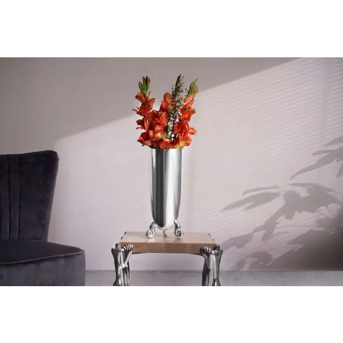This large vase is the epitome of a clean style aesthetic with its bullet silhouette, sleek lines, and wave detailing. From our Wave range, it is crafted from aluminium with a mirror-polish finish and a black powder-coating on the inside. At 23cm in length, this vase stands boldly on wave-inspired sculptural legs. Fill with a bouquet of seasonal blooms, or use it on its own to grace your hallway, library, and other living spaces. Explore other pieces in our Wave range to enhance various parts of your home. To clean, wipe with a soft cloth.